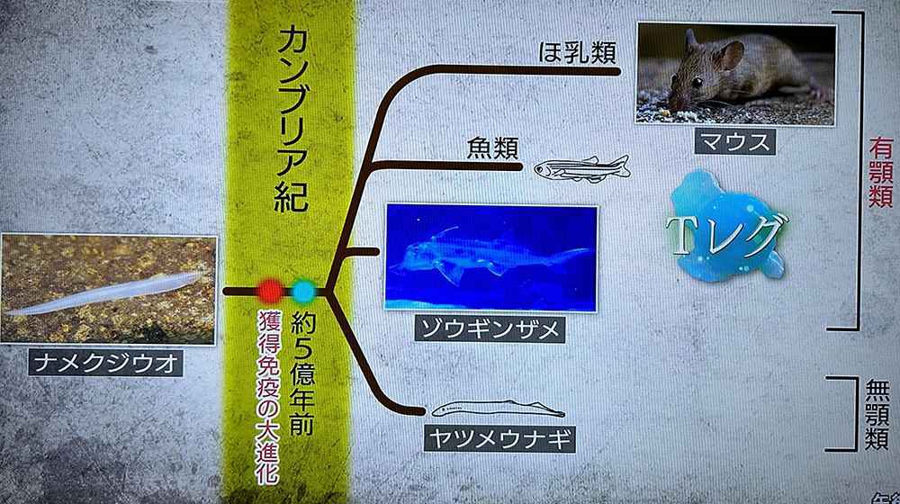 ゾウギンザメという古代魚がいるそうで、約5億年前に初めて下顎を持ったと言われています。そして、初めて「獲得免疫」システムを持った脊椎動物と言われていています。それ以前の魚は、ナメクジウオのように顎も無く「自然免疫」しか持っていなかったそうです。