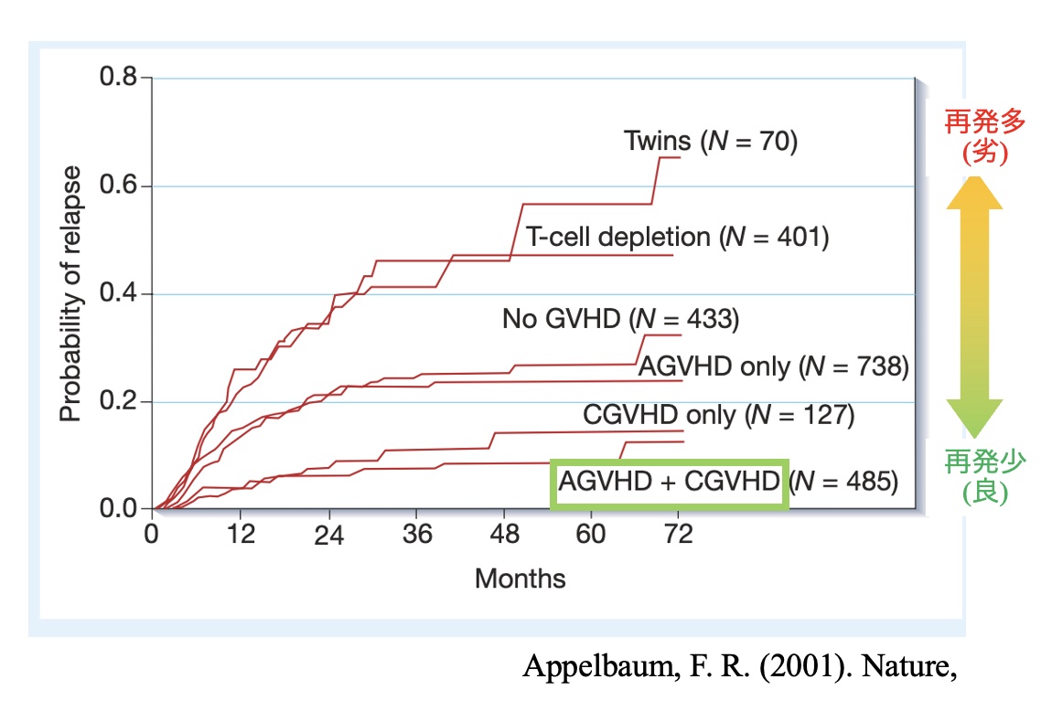 グラフから分かるようにGVHDを起こしている患者が治療効果が高いことが示され、GVHDという免疫反応を意図的に狙っている(GVT効果)ことが分かります。