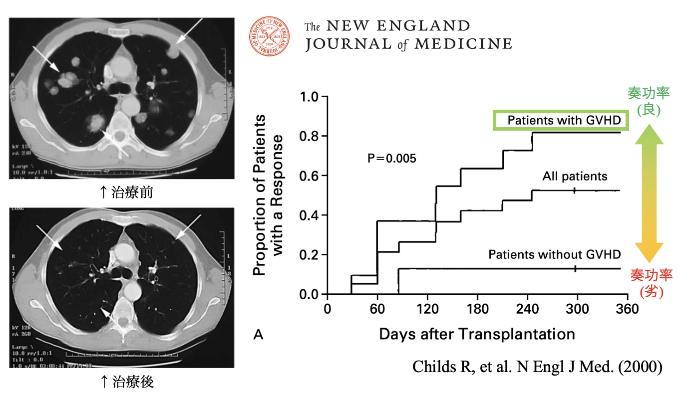 2000年、New England Journal of MedicineというトップジャーナルにGVHD/GVT効果を腎臓がんに応用した治療が報告されました。